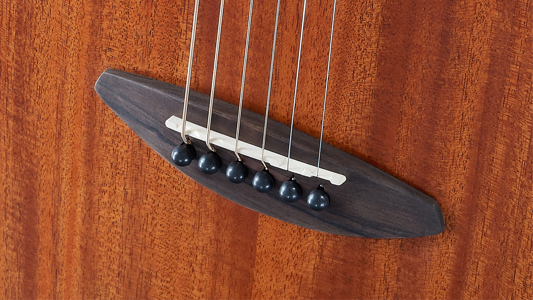 鳥吉他定製的微笑造型琴橋,使用硬度較高的玫瑰木,能支撐琴的後段琴弦張力。搭配水牛骨弦枕,質地堅硬清脆,能有效的傳導琴弦的共鳴。