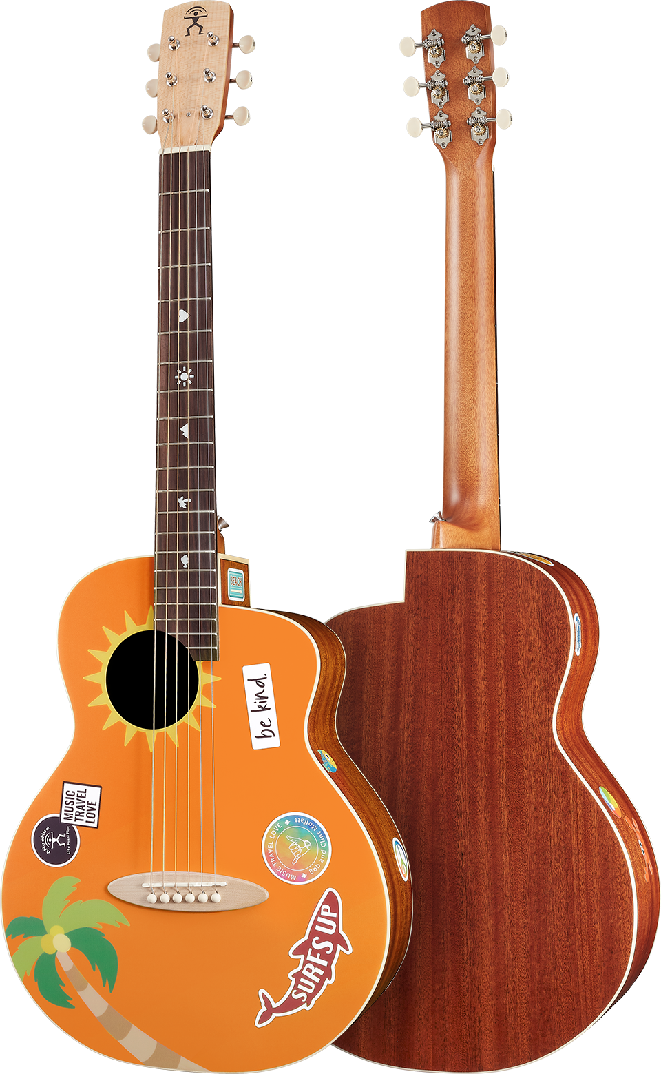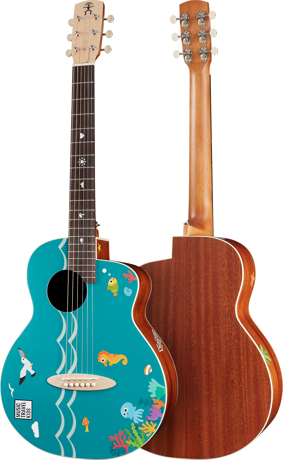 The exclusive stickers that come with the guitar are all water-repellent, and can be repeatedly peeled and pasted without damaging the surface of the guitar! There are two different styles of "travel life" and "ocean life", which can be decorated in any surface such as a guitar、luggage、motorcycle、safety helmet...anywhere you like! Put them on and show your lifestyle and creativity to the world, wherever you go!