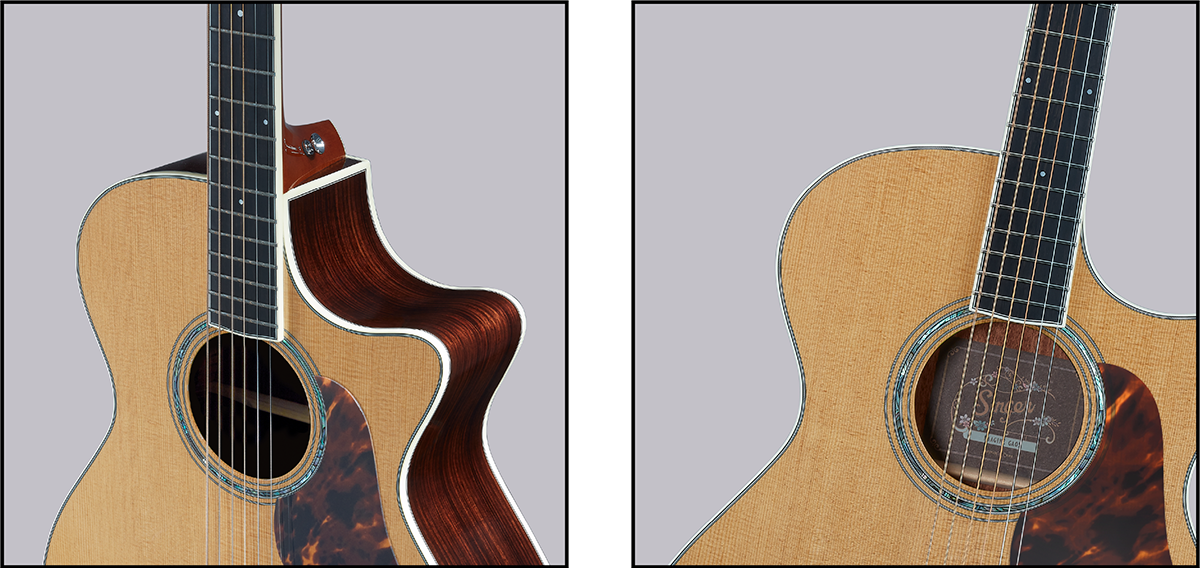 The guitar's details are luxurious yet disciplined, with ivory white binding on the body, fingerboard, and headstock, and abalone inlays on the headstock logo and soundhole rosette, blending tradition with innovation. The high-gloss finish enhances durability and adds visual sophistication, making it the perfect partner for arrangers, performers, and professional musicians on stage and in the studio.