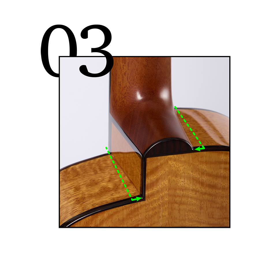玫瑰木密度高、結構穩定不易脆裂變形。鑲嵌琴身外側,不僅給予琴身保護,穩重的視覺質感也為琴身勾勒出溫潤而沉穩的輪廓。