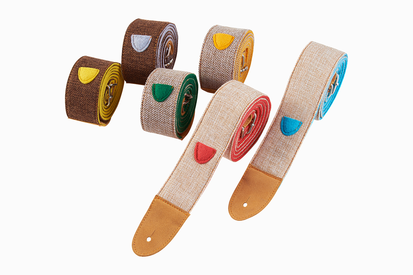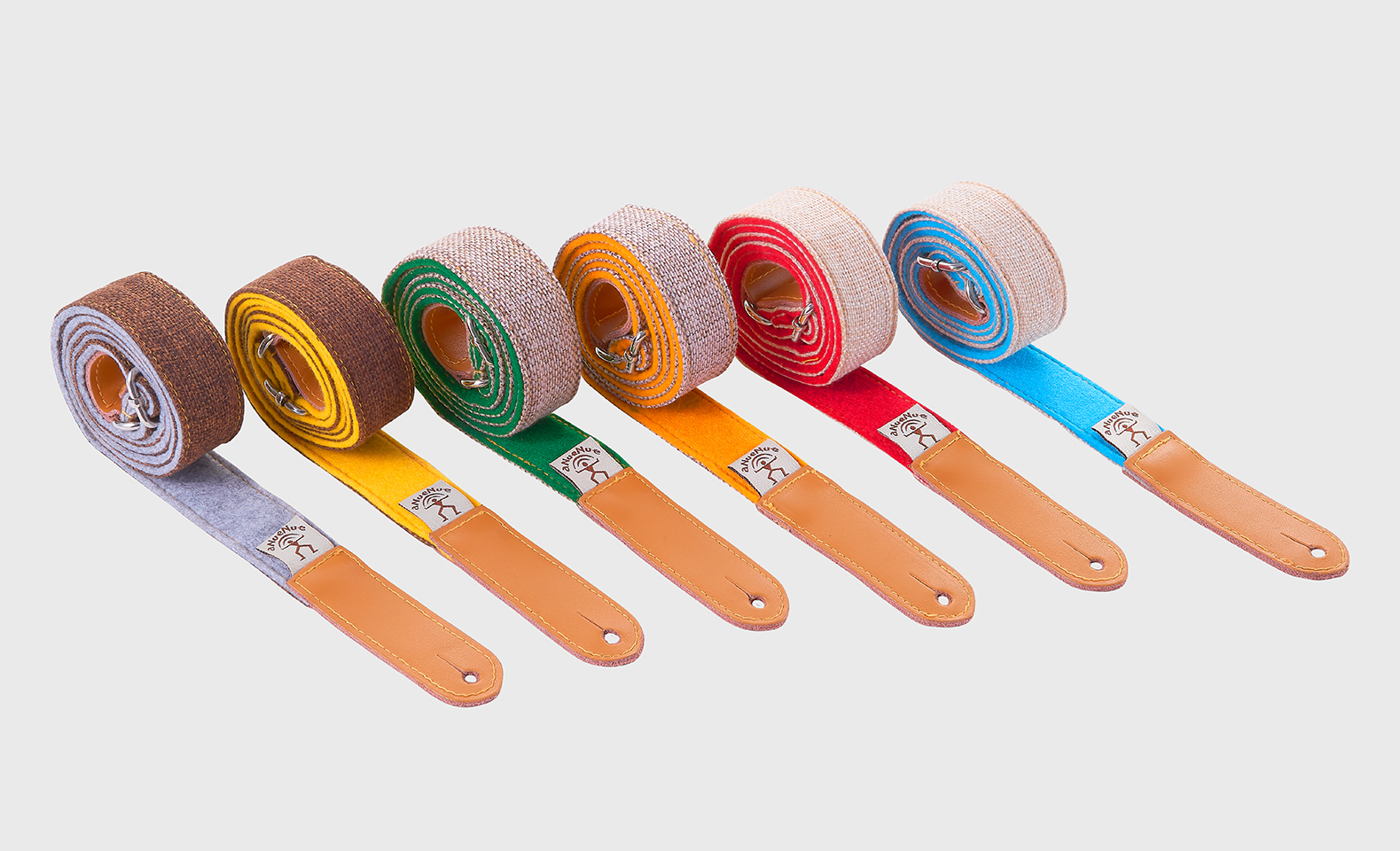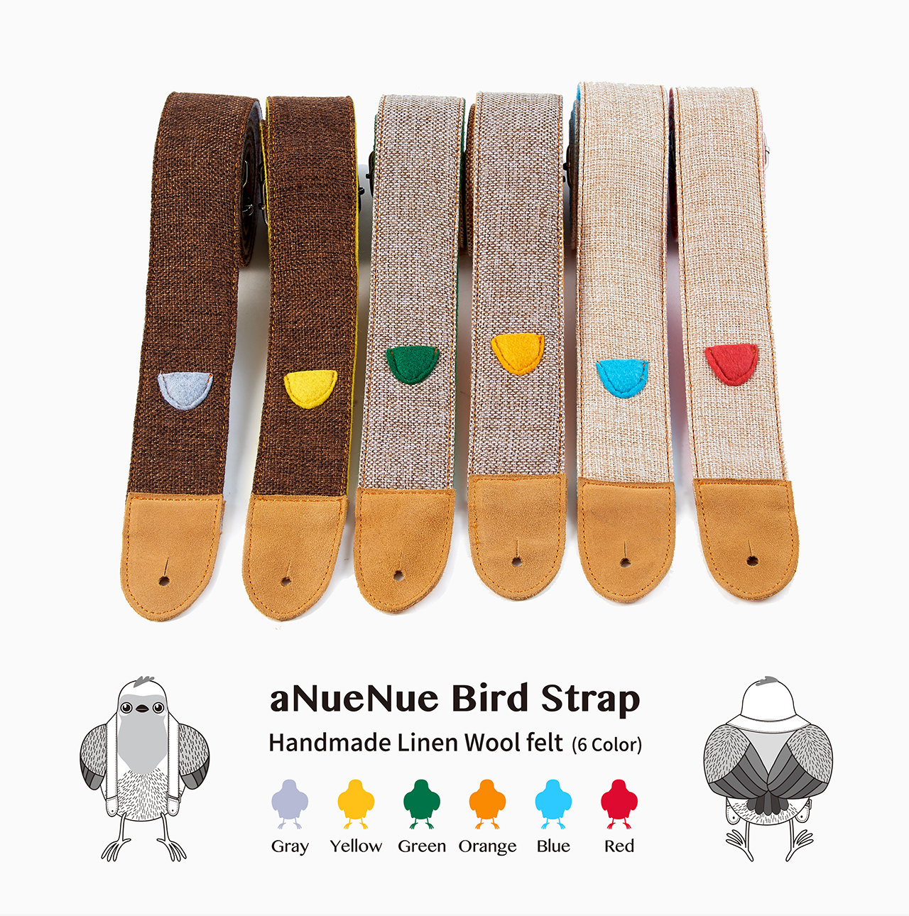 鳥背帶是以"鳥"的概念設計,搭配貼近自然的材質 ─ 麻布與混羊毛氈為主要材質,共有三種麻布顏色搭配六色混羊毛氈。背帶兩端使用兼顧質感與實用性的合成皮扣環,可直接使用於有背帶釘的琴款;讓樂器可以有效的固定,且不被刮傷。
