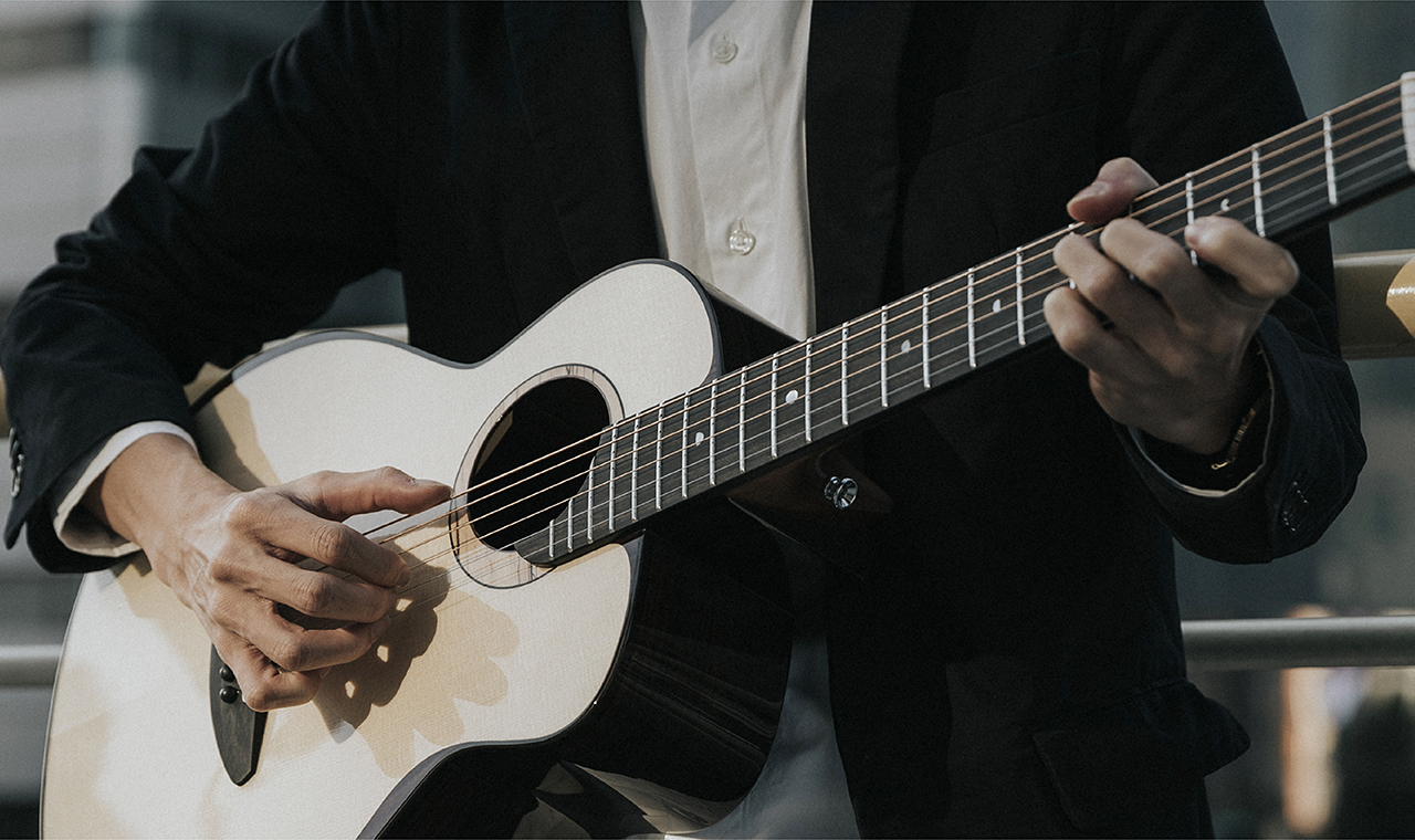 Sugita Kenji designed the Acoustic Future series, "Coherence Vibration" Air Oscillation. When string is plucked, the guitar top vibrates, it provides a coherence vibration against the body, neck, and headstock, and creates a rich spectrum of sound. Light see-through top is controlled within 2.5mm, the brace design stabilizes the top, prevents twisting, and supports the string tension. After three years of R&D, a full responsive sound is achieved, removing the hard frequency.